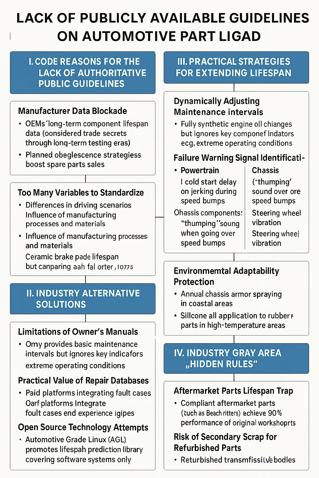 U industriji popravaka automobila ne postoji jedinstvena, javno dostupna smjernica koja sveobuhvatno pokriva životni vijek svih automobilski dijelovi . Ova situacija proizlazi iz složenosti industrije i utjecaja više varijabli. Slijedi ključna analiza ovih čimbenika: