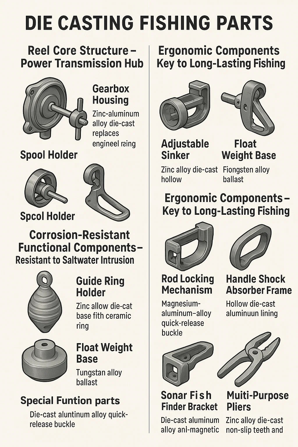 Umro lijeva ribolovni dijelovi Jez su jezgrene metalne komponente proizvedene pomoću postupka lijevanja visokog pritiska. Oni se bave ključnim zahtjevima za ribolov kao što su lagana, otpornost na koroziju i funkcionalna pouzdanost. Ključne aplikacije i značajke su sljedeće: