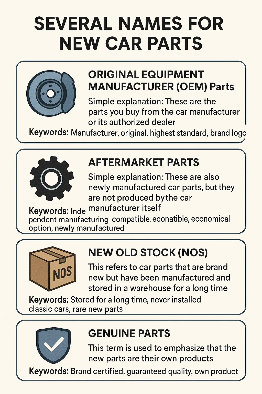 Potpuno novi dijelovi automobila imaju nekoliko uobičajenih naziva, koji se malo razlikuju ovisno o izvoru i prirodi.
