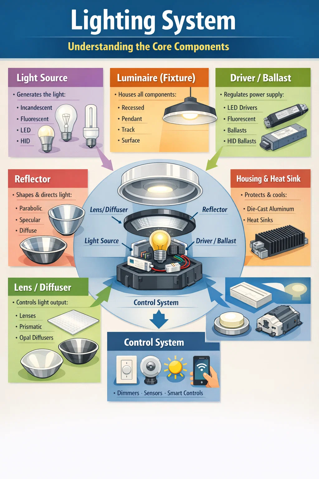 Rasvjeta nije samo osvjetljenje - to je pažljivo projektiran sustav sastavljen od različitih, međusobno ovisnih komponenti. Osnovne komponente rasvjete uključuju izvor svjetlosti, rasvjetno tijelo (učvršćenje), prigušnicu ili pogon, reflektor, leću ili difuzor, kućište i sustav upravljanja. Svaki dio igra posebnu ulogu u određivanju načina na koji se svjetlost proizvodi, oblikuje, distribuira i upravlja njome. Bilo da dizajnirate plan kućne rasvjete, postavljate poslovni prostor ili rješavate probleme postojeće instalacije, razumijevanje ovih dijelova daje vam odlučujuću prednost.