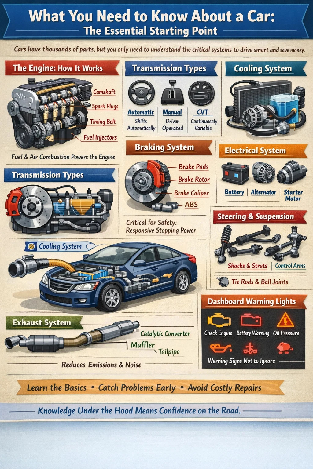 Svaki automobil na cesti skup je međusobno povezanih sustava i ne morate biti mehaničar da biste ih razumjeli. Tipično vozilo sadrži otprilike 30 000 pojedinačnih dijelova , ali velika većina vlasnika automobila treba razumjeti samo djelić njih kako bi bili sigurni, uštedjeli novac i donosili informirane odluke u radionici. Ovaj vodič prolazi kroz automobilske dijelove i sustave koji su zapravo važni svakodnevnim vozačima - od onoga što se nalazi ispod haube do onoga što održava vašu vožnju glatkom i vaše kočnice osjetljivima.